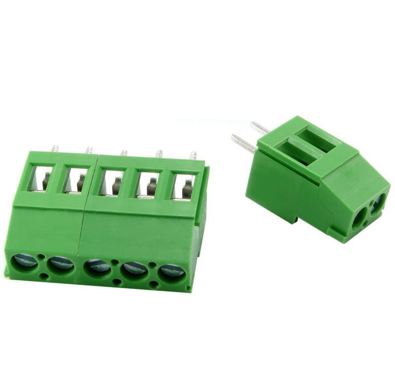 Borne 180º, modular (2 ou 3 vias por bloco) para PCI. Com altura de 18mm e passo de 5,08mm. Para fios de 12 a 24AWG. Cor verde (16A/300VCA).